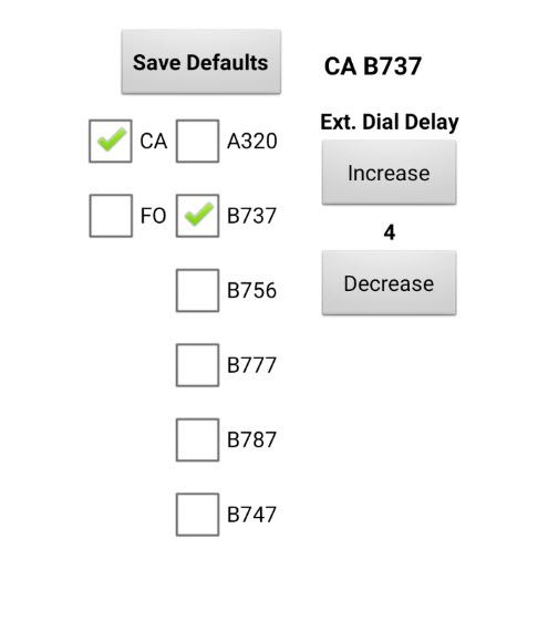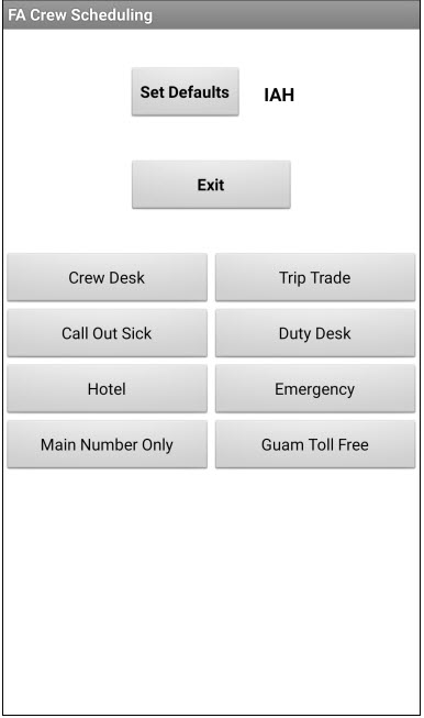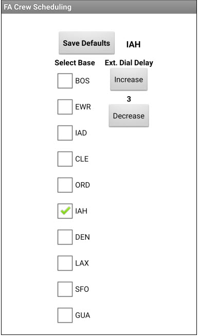 | Crew Scheduling "Set Defaults" screen - Select your information for dialing extensions | |
