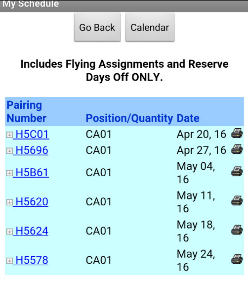 View My Schedule screen - For offline viewing - clicking on a pairing functions exactly like online